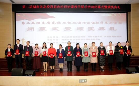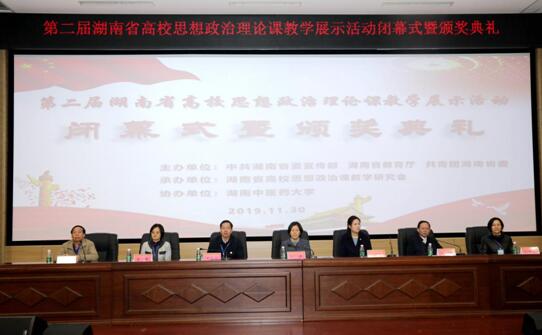 11月30日上午,由湖南省委宣传部、省教育厅、共青团湖南省委主办、湖南省高校思想政治理论课教学研究会承办、湖南省中医药大学协办的第二届湖南省高校思想政治理论课教学展示活动在湖南省中医药大学举行。省教育厅党组成员、省委教育工委委员徐伟、团省委副书记钟娜、省高校思想政治理论课教学研究会常务副会长、我校校长刘起军、湖南省中医药大学党委副书记肖小芹等出席闭幕式暨颁奖典礼。