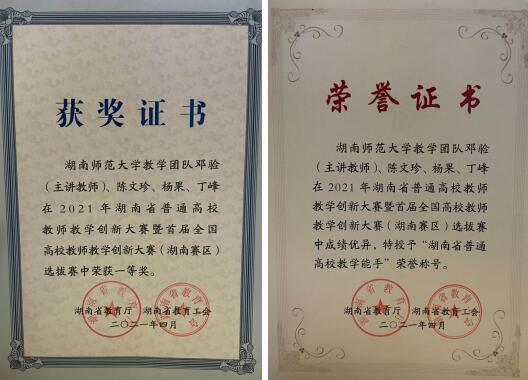 日,湖南省教育厅和省教育工会公布了2021年湖南省普通高校教师教学创新大赛暨首届全国高校教师教学创新大赛(湖南赛区)选拔赛结果我院教学团队邓验(主讲教师)、陈文珍、杨果、丁峰荣获一等奖,并被授予“湖南省普通高校教学能手”荣誉称号。