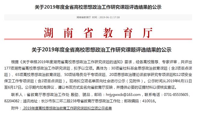 近日,湖南省教育厅下发《关于申报2019年度湖南省高校思想政治工作研究课题的通知》,经各高校推荐、专家评审,我院教师邢鹏飞主持《高校用习近平新时代中国特色社会主义思想铸魂育人方法创新研究》、陈丽荣主持《“互联网+”时代大学生社会主义意识形态认同现状与对策研究》均获省社科基金课题立项、冷舜安主持的《构建人类命运共同体视域下大学生全球意识培育研究》获高校思想政治教育课题立项。
