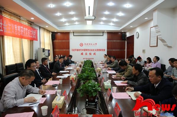李民介绍了学校成立习近平新时代中国特色社会主义思想研究院的背景、目的和学校的优势。他说,在刚刚胜利闭幕的中国共产党第十九次全国代表大会上,习近平总书记在工作报告中鲜明地提出了习近平新时代中国特色社会主义思想和基本方略,深刻回答了新时代坚持和发展中国特色社会主义的一系列重大理论和实践问题,是新时代夺取中国特色社会主义伟大胜利的政治宣言和行动纲领。为我们把握新时代、夺取新胜利提供了新的战略指引。作为湖南省省属高校中唯一的国家“双一流”建设高校,我们必须责无旁贷地把学习研究、宣传阐释习近平新时代中国特色社会主义思想的重任切实承担起来,不断巩固马克思主义在高校哲学社会科学中的指导地位,不断推进马克思主义中国化的最新成果——习近平新时代中国特色社会主义思想进教材、进课堂、进学生头脑,不断增强习近平新时代中国特色社会主义思想的理论魅力、育人合力、落实效力,为推动党的理论创新、服务国家和地方经济社会发展提供更多、更新、更好的学理支撑和决策参考,为我们党在新时代进行伟大斗争、建设伟大工程、推进伟大事业、实现伟大梦想做出新的更大贡献。他表示,要努力将研究院打造成国内知名、省内领先的重要研究基地和宣传教育平台。