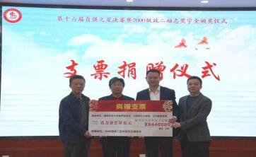 社会爱心人士代表温钊和、邓乃根、计文勇,校友代表喻晓坤、田浩,学院代表陈红桂、胡雪松进行“2000级政教二班励志奖学金”支票交接与捐赠仪式;陈红桂、胡雪松代表两个学院向社会爱心人士赠送锦旗。