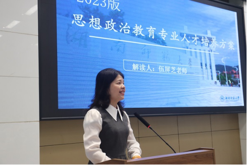 伍屏芝主任从培养目标、毕业要求、学制学分学位、课程结构等方面解读了2023版思想政治教育专业人才培养方案。她指出相比2021版的人才培养方案,新方案进一步完善了培养目标和课程设置,学院将着力于培养践行师德、学会教学、学会育人、学会发展的高素质、专业化、创新型卓越思想政治理论课教师。