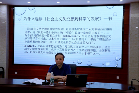 刘先江从“为什么要研读原著”与“为什么选读《社会主义从空想到科学的发展》一书”引入,首先分析了《社会主义从空想到科学的发展》的写作背景,点明经典要将其放在特定的历史背景中来读,强调读原著要密切联系实际,既要回到过去,又要关注现在,指导未来;接着对该书的写作框架进行探究,深入分析了其“思想来源”“理论基础”“基本理论”,帮助同学们理清了其中的逻辑思路;最后,刘先江教授以“理论的当代回响”为题,分析了现今社会实践中理论指导实践的已有成效,并警示同学们要明辨理论陷阱,要有自己的思考而不是随波逐流,要用科学的理论武装头脑、指导实践。