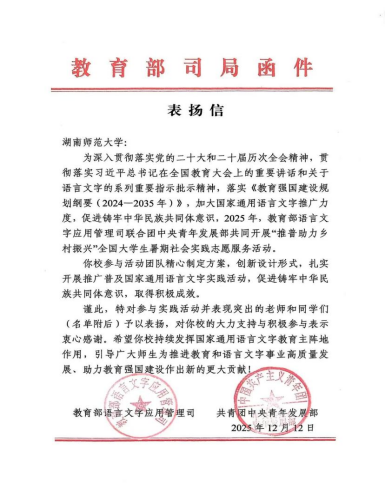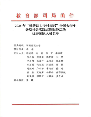 近日,教育部语言文字应用管理司、共青团中央青年发展部对2025年“推普助力乡村振兴”全国大学生暑期社会实践志愿服务活动中表现优异的集体、个人予以表彰,我院思想政治教育专业2023级本科生郑丽宏、2024级本科生刘嘉琪同学参与的实践团队立项入选全国重点团队,结项获评全国优秀团队。团队由我院副教授、硕士生导师龚曦老师指导。