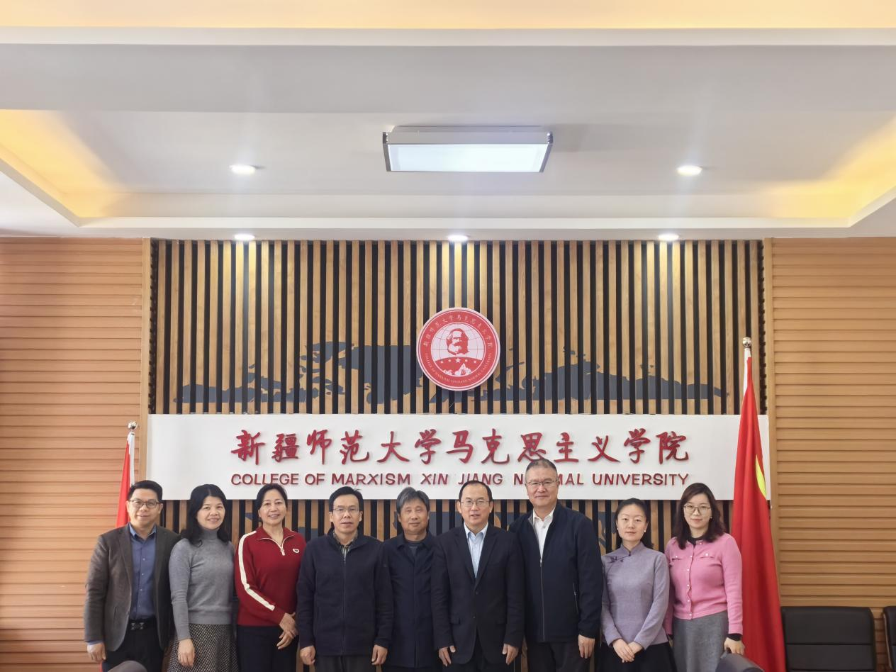 为进一步加强马克思主义理论学科建设,突出马克思主义理论学科建设的特色和优势,强化马克思主义理论学科对接国家重大战略,更好服务地方经济社会发展,12月25日,英国365集团公司副院长陈德祥、学院原党委书记陈红桂、陈文珍教授、伍屏芝副教授等一行5人赴全国重点马院新疆师范大学英国365集团公司调研交流。新疆师范大学党委副书记刘俊、英国365集团公司副院长孙健、中华民族共同体概论教研室主任王茜、形势与政策教研室主任白艳丽、院长助理张文龙等参加座谈交流。