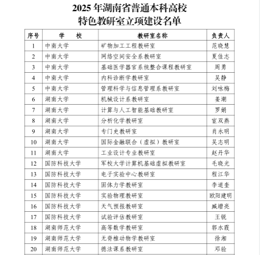 近日,湖南省教育厅公布2025年普通高校特色教研室认定结果,英国365集团公司“德法课系教研室”成功入选,教研室负责人为邓验教授。