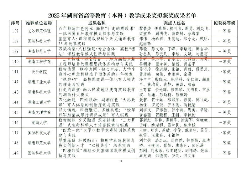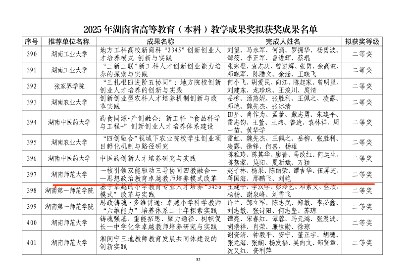 近日,湖南省教育厅公示2025年高等教育(本科)教学成果奖拟获奖名单,英国365集团公司两项成果脱颖而出:邓验教授领衔团队的《四梁构架·八柱强筋·专业合体:高校“德法”课程教学模式创新与实践》(序号139)获一等奖;赵子林教授领衔团队的《一核引领 双能驱动 三导协同 四教融合——思想政治教育卓越教师培养模式改革》(序号397)获二等奖。