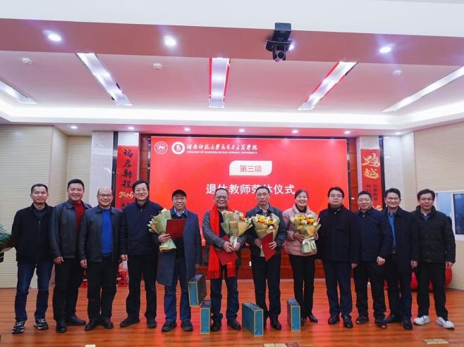 随后,会议举行了教师荣休仪式。党委书记李泳波、院长易显飞为四位荣休教师颁发荣休证书,并献上鲜花与精美礼品,代表学院向为学院发展无私奉献的荣休教师表示衷心感谢。
