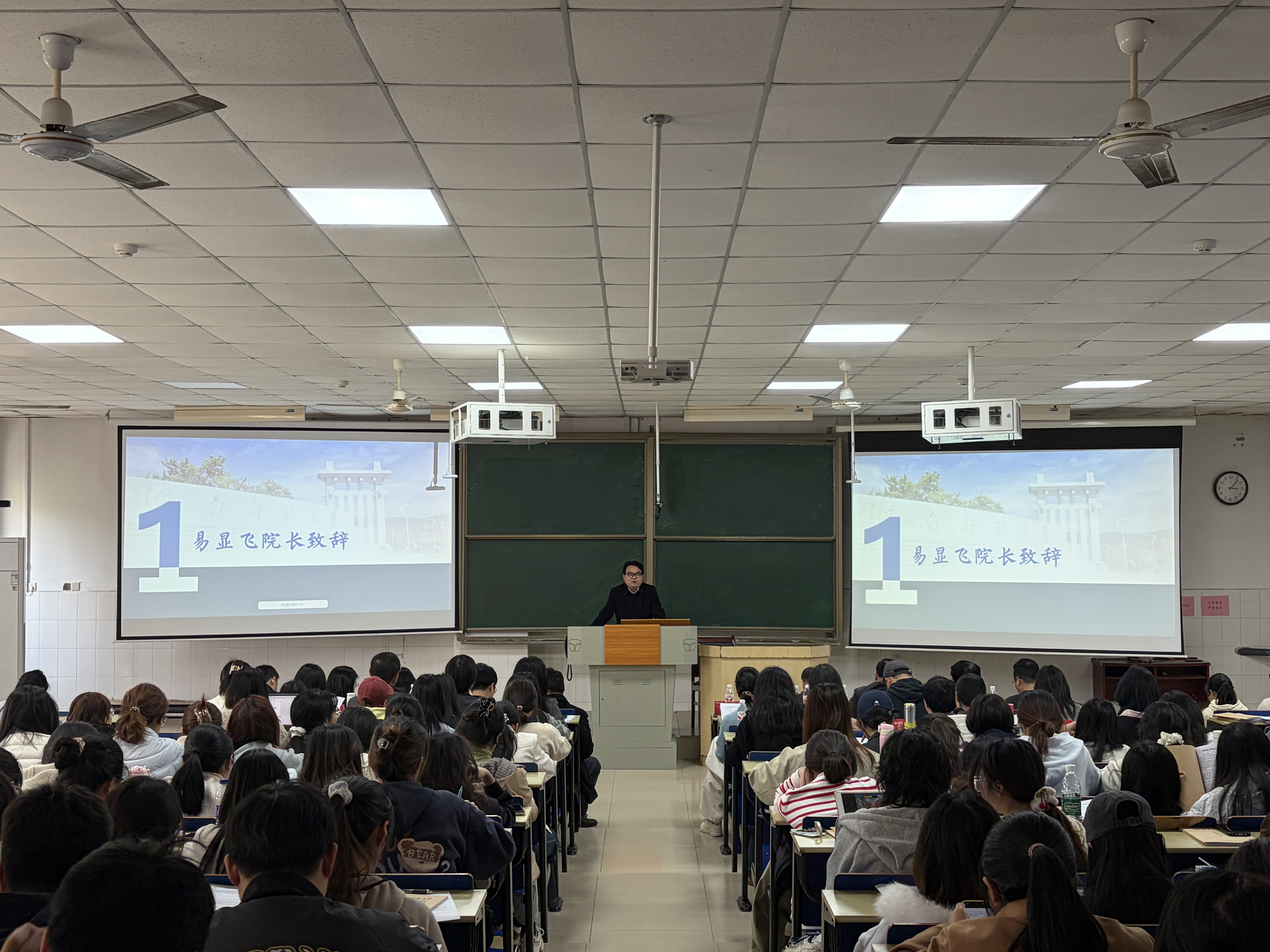 易显飞院长作大会致辞。易院长向所有实习指导老师表示诚挚感谢,为即将踏上实习岗位的同学送上衷心祝福。易院长指出,教育实习是把思政理论转化为铸魂育人实践的“第一课堂”,也是师范生成长为合格人民教师的“必修课”。易院长从站稳政治立场、心怀师者大爱、勤学善思笃行、严守纪律规矩四个维度向实习生提出了要求,希望同学们努力成为优秀的思政课老师。
