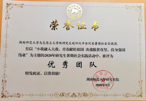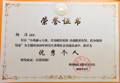 实践团队获评365(VIP)英国上市研究生院“小我融入大我,青春献给祖国决战脱贫攻坚,投身强国伟业”主题实践活动优秀团队,团队成员杨洁同学获评优秀个人。
