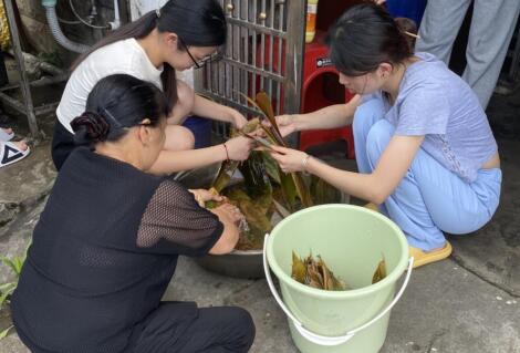 走进卢桂香老人家中,队员们热情地和老人们打招呼。大家把事先准备好的箬叶放进大盆内,一片片箬叶在队员和老人们手中翻转、冲洗,呈现着一片忙碌景象。