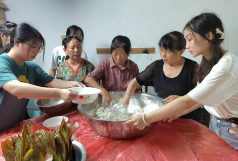 队员和老人们围坐在一起包箬叶粑粑。在老人们手把手指导下,队员慢慢掌握了包箬叶粑粑的窍门,箬叶在手中飞舞,包裹住一颗颗拳拳的敬老之心。一片碧绿,一根草绳,一缕清香包裹的是传承百年的味道。