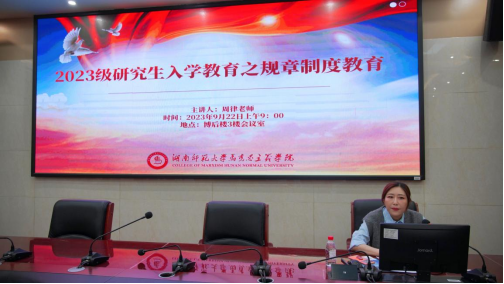 9月22日,我院2023级研究生入学教育进入第五课--规章制度专题教育。科研办主任周律老师主讲,2023级全体研究生参加。