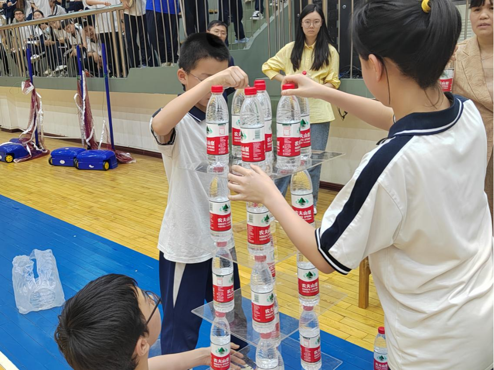 在实习队员的引导下,各班有序前往体育馆、操场两处科技节活动场地。此次科技节活动包括初一组“纸质承重”比赛和初二组“彗星撞地球”比赛,来自初一、初二各班的参赛选手各显本领,展示自己多日实验得出的科技成果。实习队员们在观看活动的同时,也不忘维持着班级的秩序,记录下选手们的精彩瞬间。