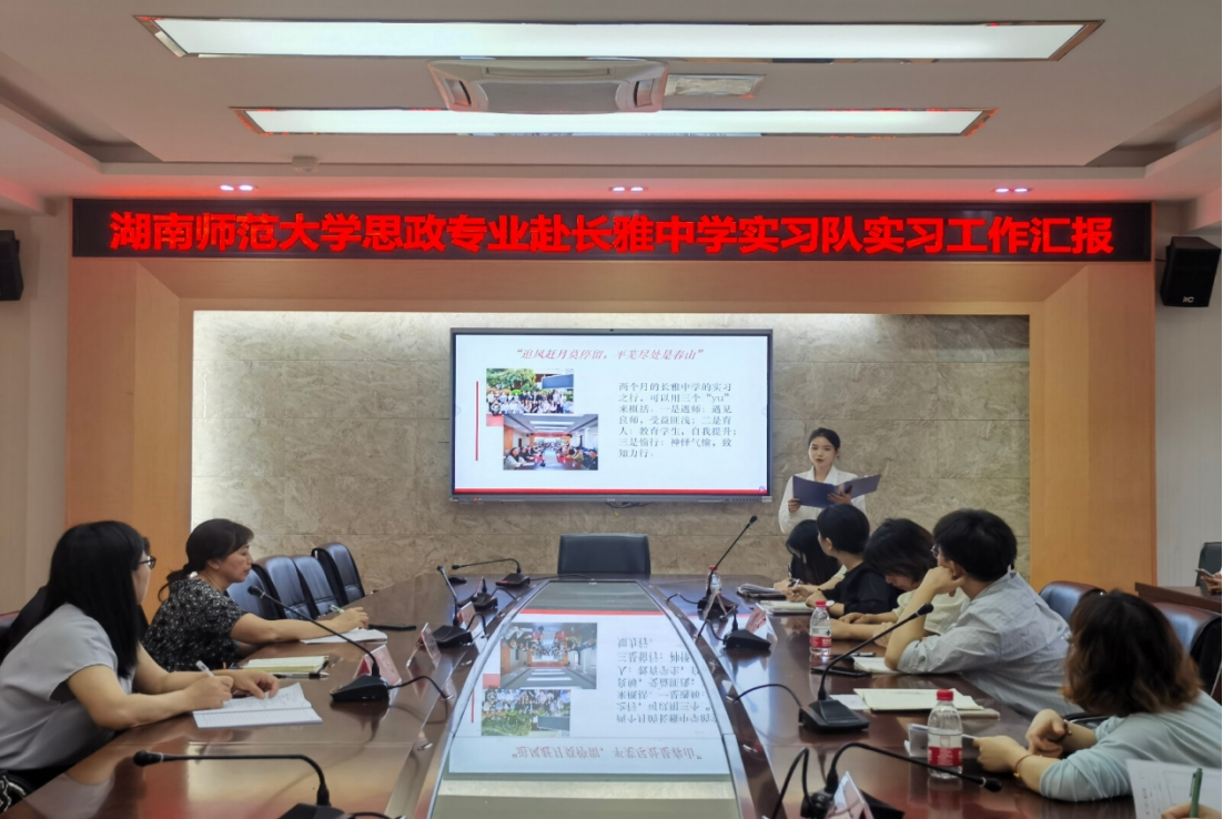 (通讯员 戴佳悦 曹湘)5月15日下午,我院赴长雅中学实习队于长雅中学综合楼三楼会议室开展实习工作汇报会。参与此次汇报会的有长雅中学教务处主任熊熠文,初三年级主任杜小露,政治教研组组长吴珂,初一年级政治备课组组长谭伟容,政治教研组老师们,英国365集团公司教授蒋国海,实习队指导老师陈文珍和朱飞,以及实习队全体队员。