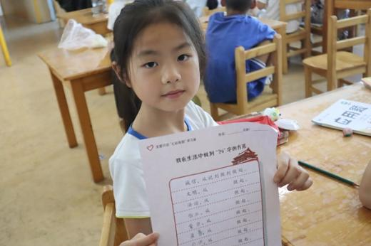 此次课程由实践团教学组老师王曼组织开展。课堂中,实践团成员通过情景创设的方式向同学们介绍价值观与个人成长的关联,让学生在参与中体验合作、友爱、尊重等价值观。同时,实践团成员还通过讲解和讨论的方式,引导学生思考和分析各种情境中的价值观问题,学会辨析不同价值观。此外,实践团成员还介绍了许多时代楷模,带领学生从中感悟价值观对人的一生甚至社会的影响。课后,老师发放了有关社会主义核心价值观图纸,并让学生们在图纸上写下自己的理解,使学生们通过图画和文字的形式加深记忆。