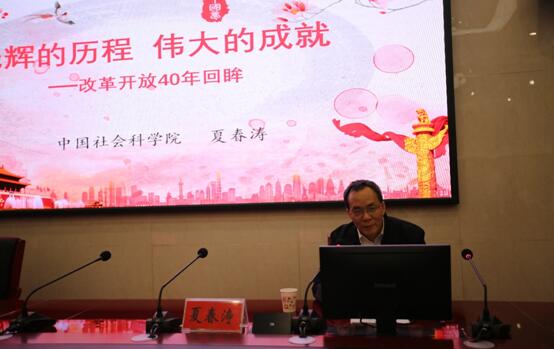 夏教授分析了改革开放的时代背景、回顾了40年的光辉历程及伟大成就、总结改革开放的深刻启示,展望了中国特色社会主义发展的未来前景。他指出党在改革开放过程中开创、坚持和发展了中国特色社会主义,形成了一系列新的理论成果,为坚定“四个自信”奠定了厚实的理论与现实基础。他认为40年的改革开放既成就了中国,也深刻影响了世界;40年的经验告诉我们:“一个中心,两个基本点“的基本路线是党和国家的生命线、是人民的幸福线;在国际风云变幻的今天,我们必须更加坚定维护以习近平同志为核心的党中央的权威和集中统一领导,走中国路,圆中国梦。