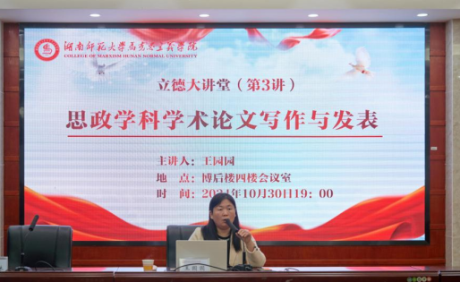 10月30日,北京师范大学《思想政治课教学》杂志社编辑部主任、副编审王园园莅临我院,作主题为“思政学科学术论文写作与发表”的专题讲座。副院长李超民、陈德祥,朱飞老师及部分研究生参加,赵子林副院长主持讲座。