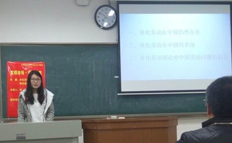 王少菲同学以“从异化劳动看当代中国的劳动问题”为中心主题做了详细的阐述。介绍了异化劳动现象在中国社会主义初级阶段仍然存在的原因、异化劳动在当代中国市场经济体制下的具体表现,以及在社会主义初级阶段我们该如何克服劳动异化带来的负面影响,表明了异化劳动的扬弃是一个长期而艰巨的过程。劳动异化的现象不只存在于资本主义私有制条件下,即使是在社会主义制度下的中国,仍不能避免劳动异化,虽然说只有最终实现共产主义才能彻底地消灭异化劳动,但是在社会主义初级阶段的中国,我们仍然可以采取一系列的措施来克服劳动异化带来的负面影响,当然,这需要政府、企业和劳动者多方的配合,需要我们在社会主义现代化建设的进程中不断地探索。