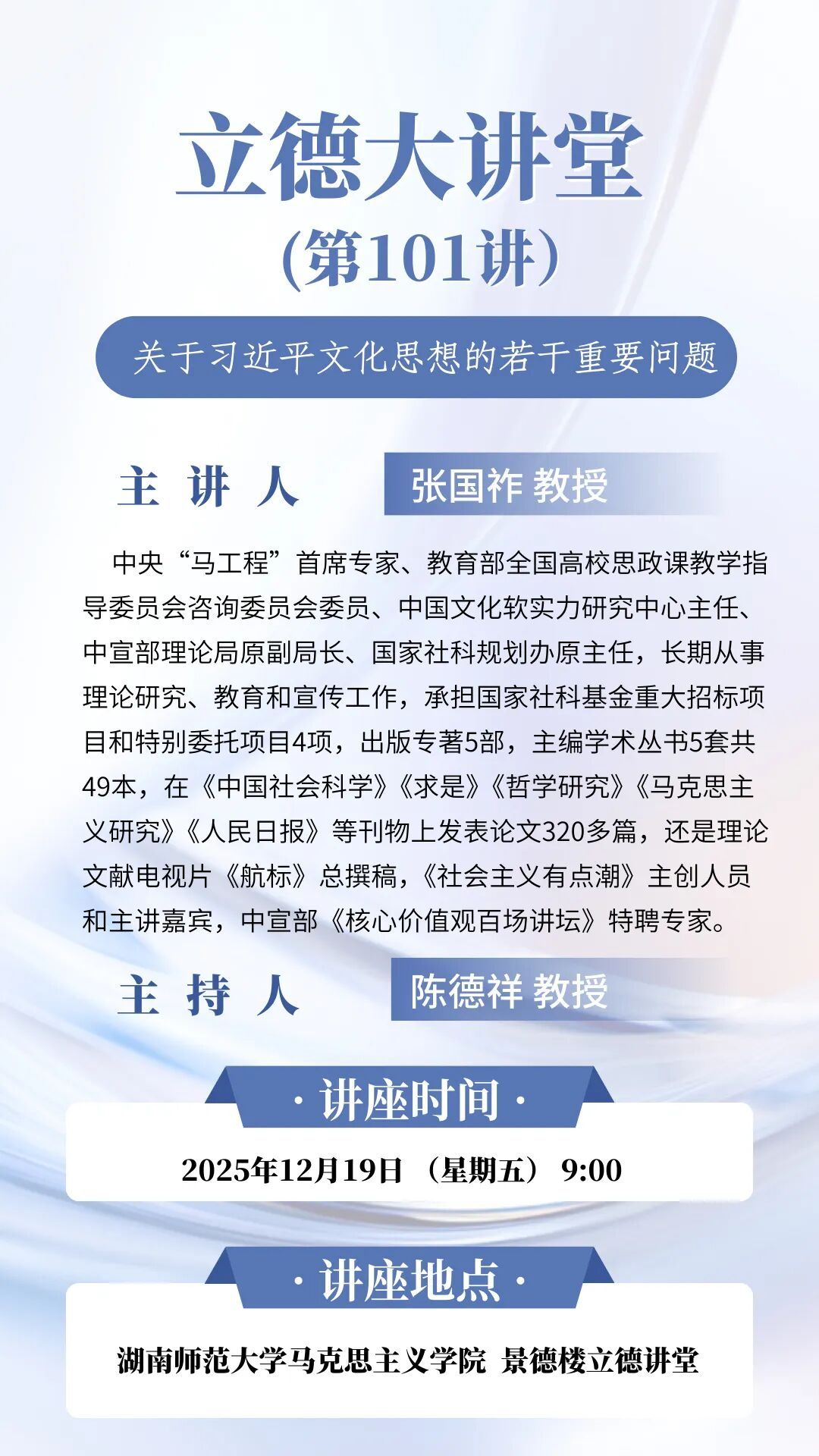 主讲人介绍:张国祚,中央“马工程”首席专家、教育部全国高校思政课教学指导委员会咨询委员会委员、中国文化软实力研究中心主任、中宣部理论局原副局长、国家社科规划办原主任,长期从事理论研究、教育和宣传工作,承担国家社科基金重大招标项目和特别委托项目4项,出版专著5部,主编学术丛书5套共49本,在《中国社会科学》《求是》《哲学研究》《马克思主义研究》《人民日报》等刊物上发表论文320多篇,还是理论文献电视片《航标》总撰稿,《社会主义有点潮》主创人员和主讲嘉宾,中宣部《核心价值观百场讲坛》特聘专家。