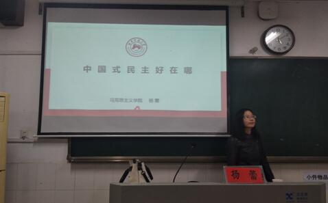 杨蕾老师聚焦中国式民主为什么好、好在哪里的问题进行了详细而精彩的论述。她指出:中国式的民主是由中国的历史文化传统所决定的,是符合中国具体国情的民主;实现民主的形式有多种多样,我们不应当被代议制或者一票一选的形式所迷惑。她用生动形象的比喻对中国式的民主的优点进行了分析,指出中国特色社会主义民主发展道路是一条光明正确的道路。我们应当走好这条道路,为人类政治文明进步贡献中国智慧。