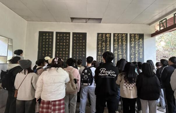 同学们来到了爱国诗词碑廊,齐声朗诵《满江红》的壮丽词句,抒发“天下兴亡,匹夫有责”的家国情怀。学生党员李陈果发表题为“汲取英雄力量,勇担历史使命”的演讲,展现了新时代青年奋发向上的精神风貌。