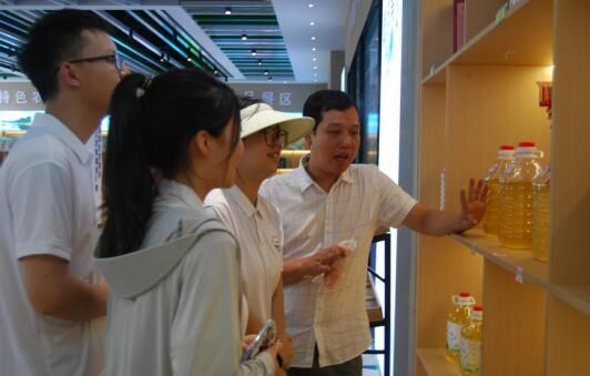 电子商务局负责人欢迎实践团的到来并带领实践团成员参观特色农产品展区、非遗展区等多个不同的商务展区。其中,他重点介绍了东安的特色美食东安鸡、血鸭的销售情况和品牌建设状况。谈及到东岸的酒文化,负责人详细介绍了富有东安特色的酒的种类、制作工序、销售情况以及和酒相关的历史寓言故事。实践团围绕东安县的电商发展状况展开提问。针对实践团所提出的问题,负责人详细阐述了电商人才的培养体系和培养流程、传统农产品在电商平台的销售情况以及电商覆盖范围的大小。结合鹿马桥的特色,负责人分析了产品的包装设计、产品形式和产销现状。随后,实践团成员前往全国电子商务进农村综合示范项目展示区和东安县电商大数据中心参观。通过参观,实践团成员了解到东安县农村电商平台的发展情况和交易状况。