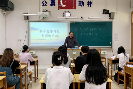 指导老师蒋国海要求实习老师以高标准开展教学实践,深度提炼教学经验,并在思政课中融入时政热点与社会议题。蒋国海着重说明教学需立足学生实际需求,并勉励实习队员以此次实践为基石,持续提升专业素养。