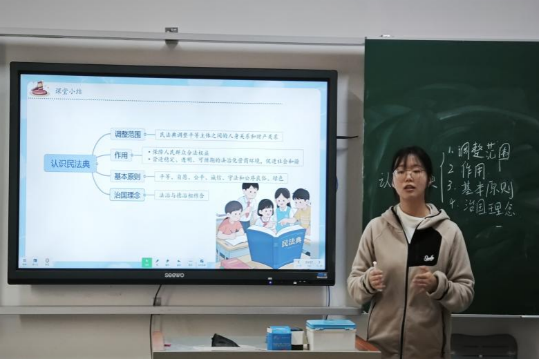 试讲过程中,5名实习学生依次登台,综合运用情境设置、案例分析、互动提问等方式,将法律知识与生活实际有机融合,讲授法律的规范与保护作用,展现了思政专业学子的教学实践能力。各位试讲者注重课堂节奏的把握,循序渐进,努力将法律知识讲清、讲透。